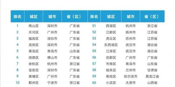 数据显示,在排名前20的城区中,广东省表现最为突出。其中,深圳市辖区个数最多,共有6个城区入围;