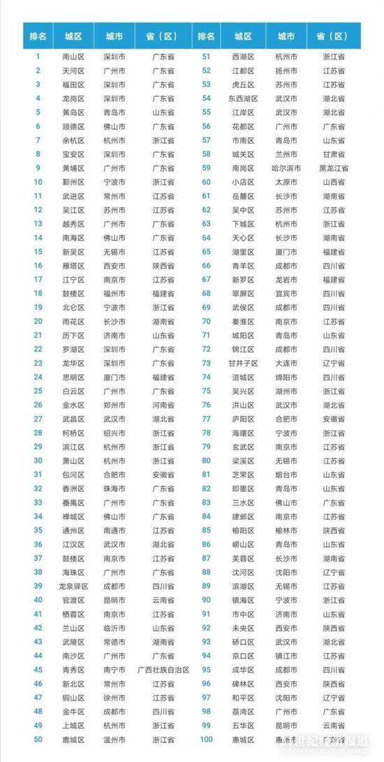 值得注意的是,广东省在百强区排名中最为突出:百强区前五名中深圳一地独占三席,而前十名中广东一省也包揽七席。