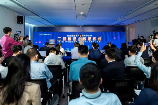 为增强专才计划二级持证人的仪式感与获得感,活动现场设计了充满金融科技元素的环节。在制证仪式上,由何杰宣布二级首批持证人证书启动在线制证环节,深圳市金融科技协会联席会长高宏在深圳会场与香港中国金融协会永远名誉主席胡章宏、澳门金融学会副主席陈伟成三地连线,运用人脸识别技术启动电子签章,在线为75份首批二级持证人证书完成认证用印制证。随后,由何杰手按启动灯柱进行授证环节,已完成制证的一张张二级持证人的证书,分发传输至接收终端,现场持证人通过手中的iPad登录下载并高举展示,现场气氛达到高潮。首批二级持证人证书展现在屏幕上逐步汇聚成“SHMFTPP”字样,与粤港澳大湾区的地图背景融为一体。