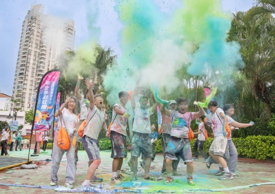 现场,跑道瞬间变成彩色海洋,大家带着一身“彩虹色”,途经卡洛儿八音盒、金涛骇浪、矿山车、雪域雄鹰、暴风秋千、玛雅水公园等经典项目,一路向终点欢乐时光主题区奔跑,全程约2.5公里。