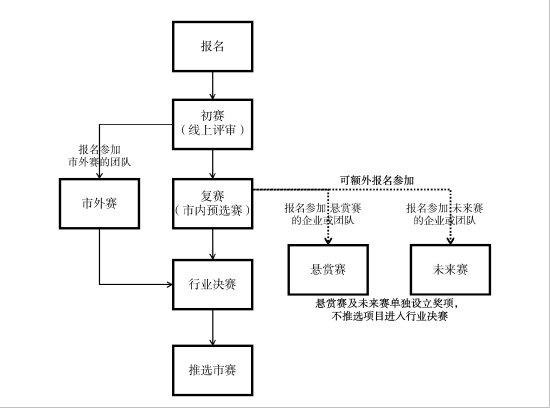 大赛分为报名、初赛、复赛(市内预选赛)、市外赛、悬赏赛、未来赛、行业决赛,最终决出企业组、团队组的一二三等奖。悬赏赛、未来赛独立设奖,决出悬赏赛、未来赛的一二三等奖。