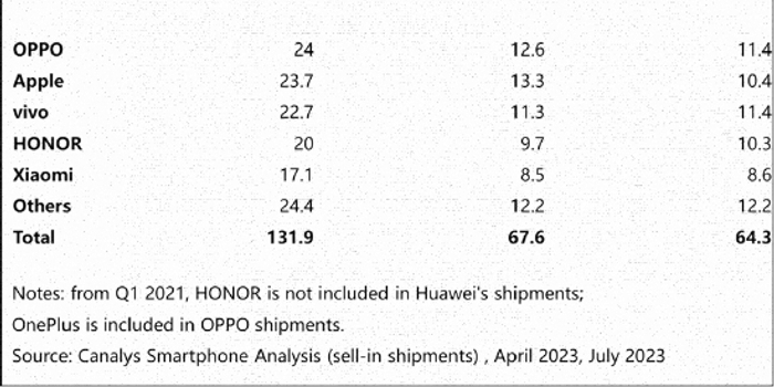 关注7月28日,最新的Canalys报告显示,2023年第二季度中国智能手机市场销量同比下跌5%。OPPO(含旗下子品牌一加)延续一季度良好表现,第二季度取得18%的市场份额,继续保持一季度的强劲增长态势,以2400万台的出货量OPPO成为国内手机市场第一。