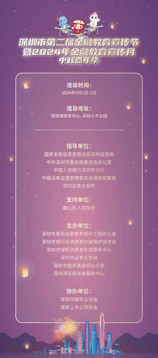 本次活动作为深圳2024年金融教育宣传月开篇序幕,将分为晚会、金融教育宣传暨中秋灯会、无人机表演灯光秀三大内容,为广大市民带来一场集金融知识普及、金融消费者权益保护与传统文化庆祝于一体的嘉年华。