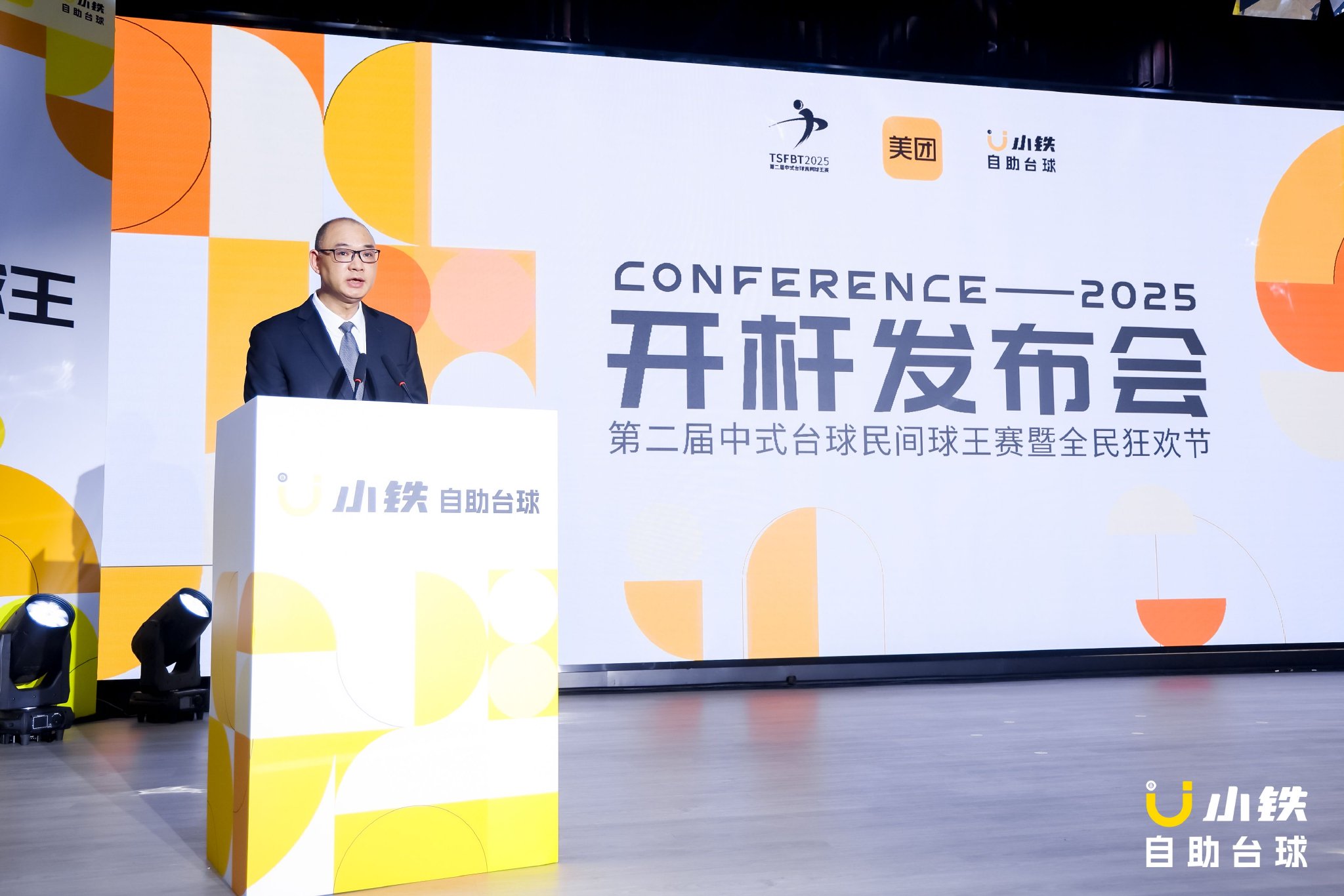 随后,美团代表——美团休娱和丽人业务部全国CKA负责人陶承东发表致辞。陶承东分享了和小铁自助台球的合作历程,并表示作为联合举办方,将通过流量扶持、场景赋能等多重方式,为赛事做好全方位保障。“我们将通过本地生活场景,助力本届台球赛事实现‘破圈’传播。”