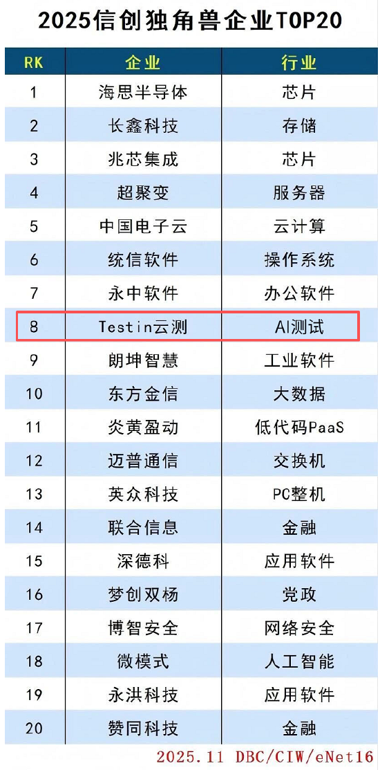 Testin云测、海思半导体、通信软件等入选“2025信创独角兽企业TOP20”