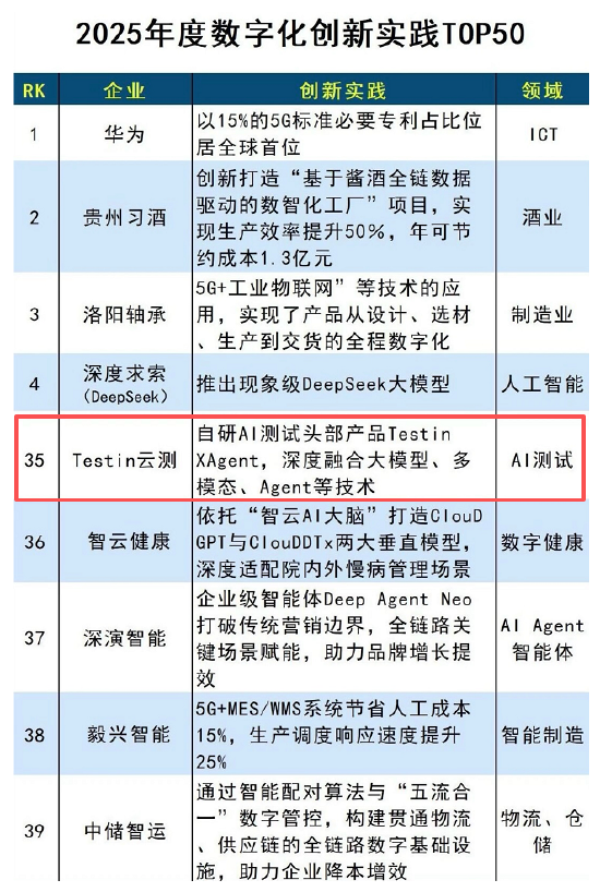 Testin XAgent入选“2025年度数字化创新实践TOP50”