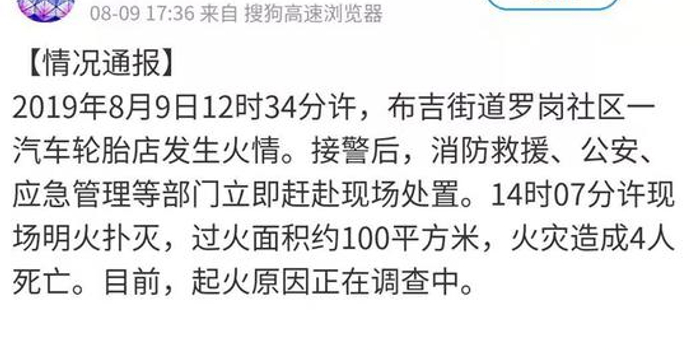 今天下午 17 时 36 分,“ 龙岗发布 ” 微博发布消息称:2019 年 8 月 9 日 12 时 34 分许,布吉街道罗岗社区一汽车轮胎店发生火情。接警后,消防救援、公安、应急管理等部门立即赶赴现场处置。14 时 07 分许现场明火扑灭,过火面积约 100 平方米,火灾造成 4 人死亡。目前,起火原因正在调查中。
