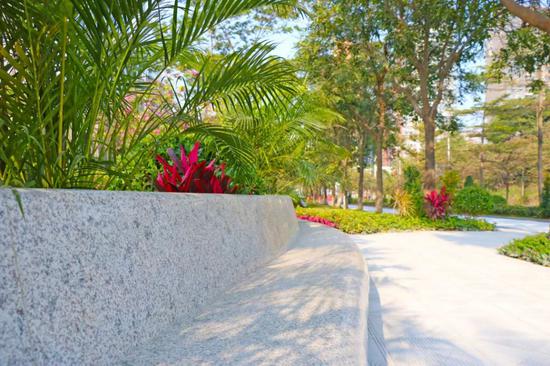 除铺设 8 款不同样式的环保砖,光源五路人行道试验段还修建了休息长廊、自行车专用道、景观绿植、各式花卉等等各种配套设施。