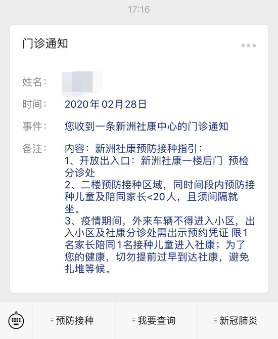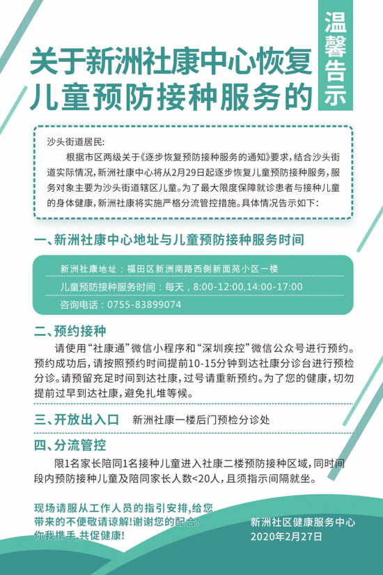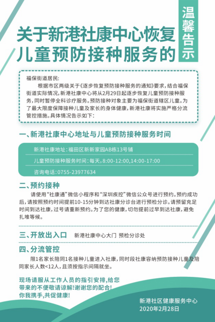 福田区慢性病防治院新洲、新港社康中心恢复儿童预防接种服务