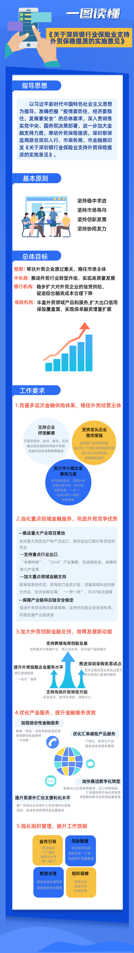 深度融合深圳外贸行业发展规划。根据广东省和深圳市的外贸行业发展规划,聚焦深圳外贸行业竞争优势,认真研究金融支持政策一并纳入《实施意见》。