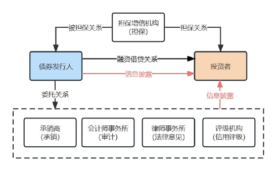 其中,发行人需对投资者承担还本付息的责任,其实质相当于融资借贷关系。部分产品中还有担保增信机构为债券的还本付息提供担保;发行人与中介机构均应在债券发行中履行信息披露义务。