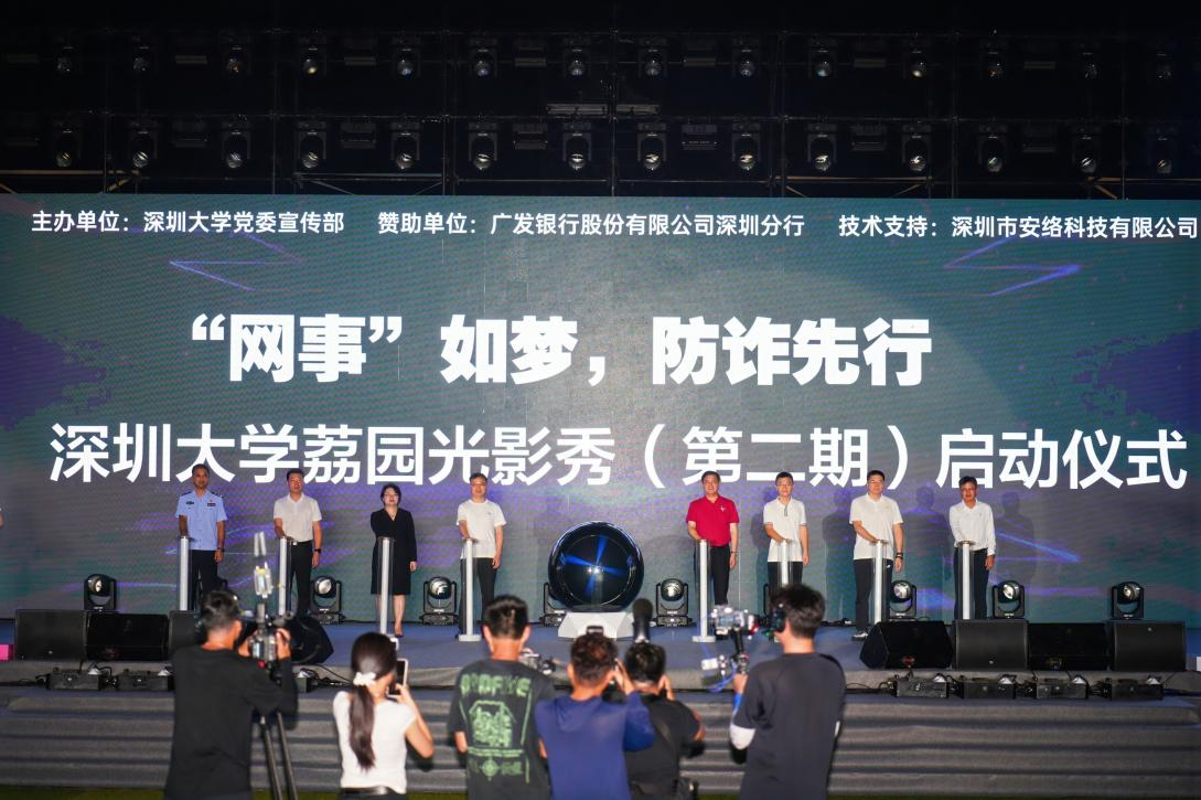 伴随着动人的音乐,深圳大学党委副书记吴报水、副校长李永华、广发银行深圳分行党委委员陈宁等领导共同启动“‘网事’如梦,防诈先行”光影秀活动。据了解,本次光影秀采用抽象艺术画形式展示,讲述一个小女孩因网络虚幻爱情而被诈骗的故事,现场观众可通过手机小程序游戏与光影秀主视觉画面互动,把“反诈”能量输入“大屏”,跃动在深大荔园的建筑上,呈现出一场主题有意义、群众齐参与的“校企”合作光影盛宴,赢得了在场深大师生的阵阵掌声和欢呼声。
