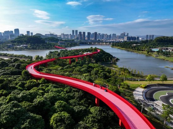 每逢周末,虹桥公园就“长”满了人,全长4公里的“红飘带”,蜿蜒于森林之中,成为城市中的生态氧吧。