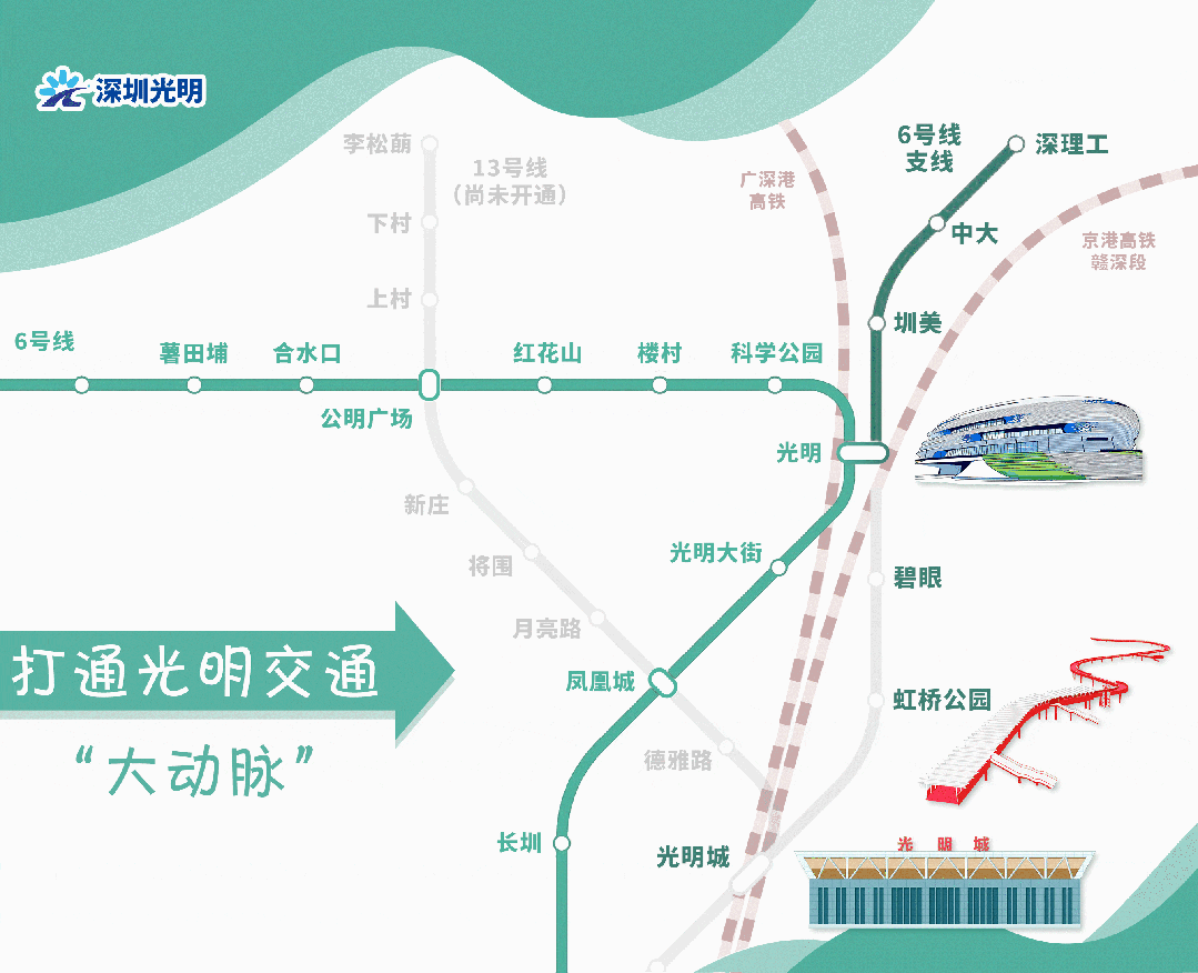 地铁13号线则连通光明科学城、南山高新园区、深圳湾超级总部基地等重点发展区域,是串联光明、宝安、南山的“科创快线”,两条线路交汇于光明城站,将形成协同效应。