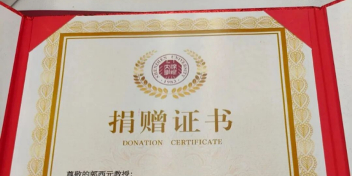 深圳大学档案馆授予郭西元教授的捐赠证书