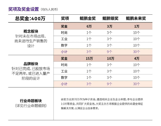 本届“鲲鹏奖”面向三大设计门类公开征集作品,包括时尚、工业、数字。