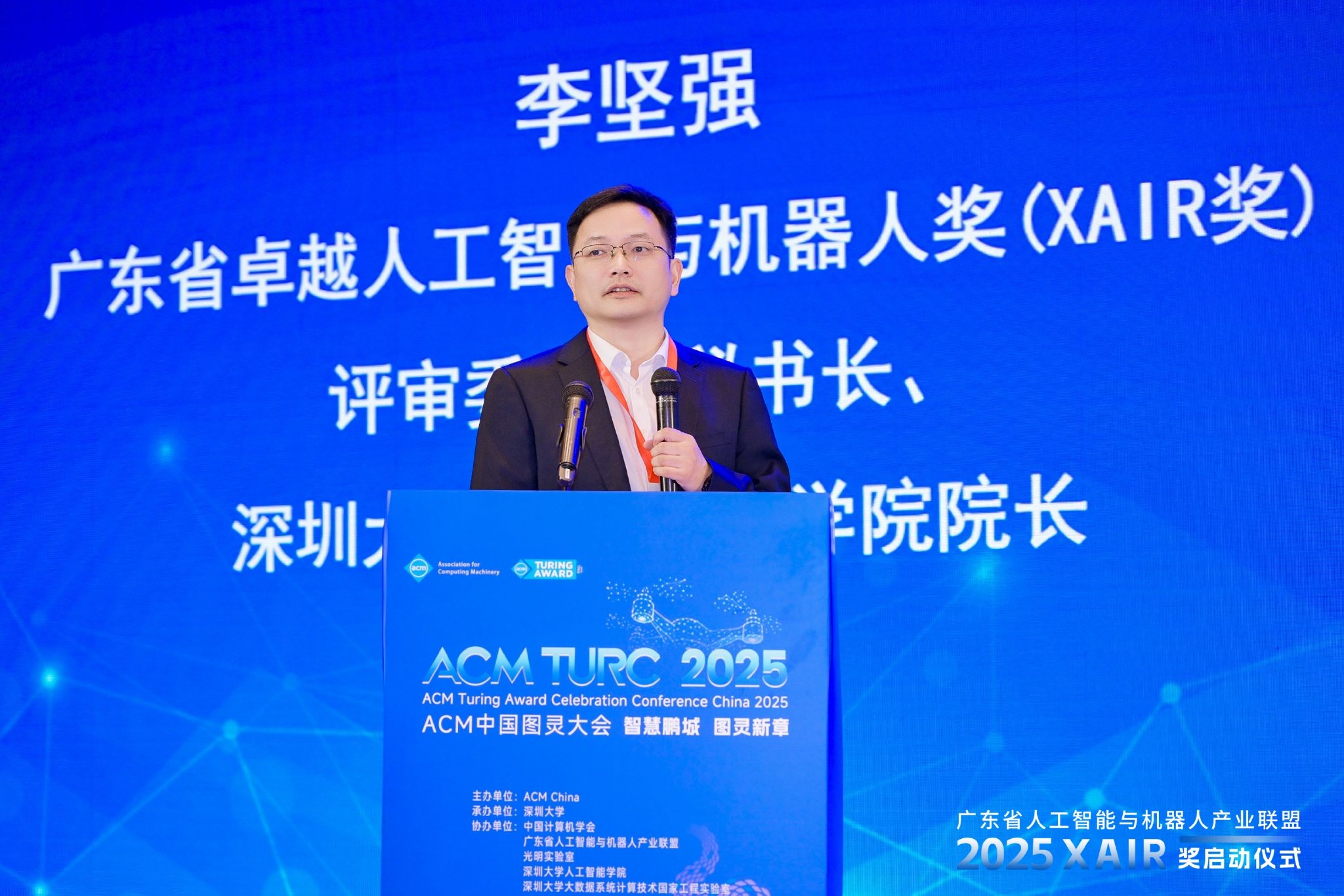 深圳大学人工智能学院院长、广东省卓越人工智能与机器人奖(XAIR奖)评审委员会秘书长李坚强介绍2025XAIR奖的设立背景、评选标准、奖金标准和申报流程等。他表示,XAIR奖旨在表彰在广东省人工智能与机器人科技工作中做出突出贡献的单位和个人,激发广大科技工作者的积极性和创造性,鼓励他们不断创新,推动行业发展,加速技术进步和突破,提升整体科技水平,提高全省人工智能与机器人产业的综合实力和水平,增强产业在国内外的竞争力。