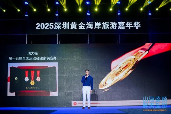 盐田本土知名品牌周大福珠宝,负责第十五届全运会奖牌设计与制作。其策略业务合作总经理黄均廷上台推介时介绍,奖牌名 “同心跃”,以 “三花映牡丹” 融合粤港澳三地花卉元素,挂环取灵感于港珠澳大桥设计成 “同心结”,外圈三组水圆用莫比乌斯环呈现,呼应盐田山海活力。未来,周大福将继续扎根盐田,携手推动本地及国家体育事业发展。