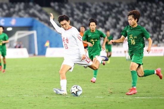 比赛当天气温转凉,天空略显阴沉,但大运中心体育场早早亮起灯光,为球员创造良好的比赛环境。浙江队与湖南队均以4-4-2阵型开场。上半场,浙江队占据场面主动,多次在对方禁区内制造威胁,湖南队门将凡中宇表现稳健,屡次化解险情。直到第30分钟,浙江队42号汤睿才叩开对方球门。