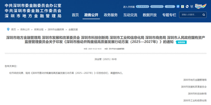 关注10月22日,深圳市地方金融管理局、深圳市发展和改革委员会、深圳市科技创新局、深圳市工业和信息化局、深圳市商务局、深圳市人民政府国有资产监督管理委员会联合印发《深圳市推动并购重组高质量发展行动方案(2025—2027年)》(简称《方案》)。
