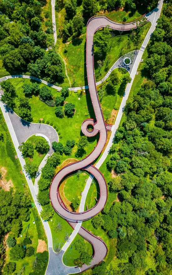 公园内有一处特色打卡地,是一座悬于林冠之上的云桥,蜿蜒的栈道如一条红色丝带,透着大气磅礴的壮阔感。