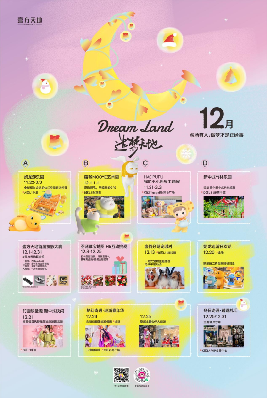 HACIPUPU圣诞主题展(壹方天地):即日起至12月下旬,壹方天地C区L1层化身为“HACIPUPU我的小小世界”。市民可前往主题场景打卡并参与小红书互动,即有机会获得HACIPUPU节日限定周边。此外,商场还推出City Boy时尚改造、奶龙趣乐园快闪等多元活动,满足不同年龄层的喜好。