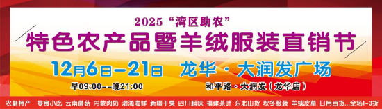 2025“助农惠民”特色农产品直销节暨羊绒皮草特卖会(龙华大润发):为积极促进龙华区经济发展建设,提升市民消费积极性。龙华大润发计划2025年12月6日- 2025年12月21日开展购物狂欢节活动。