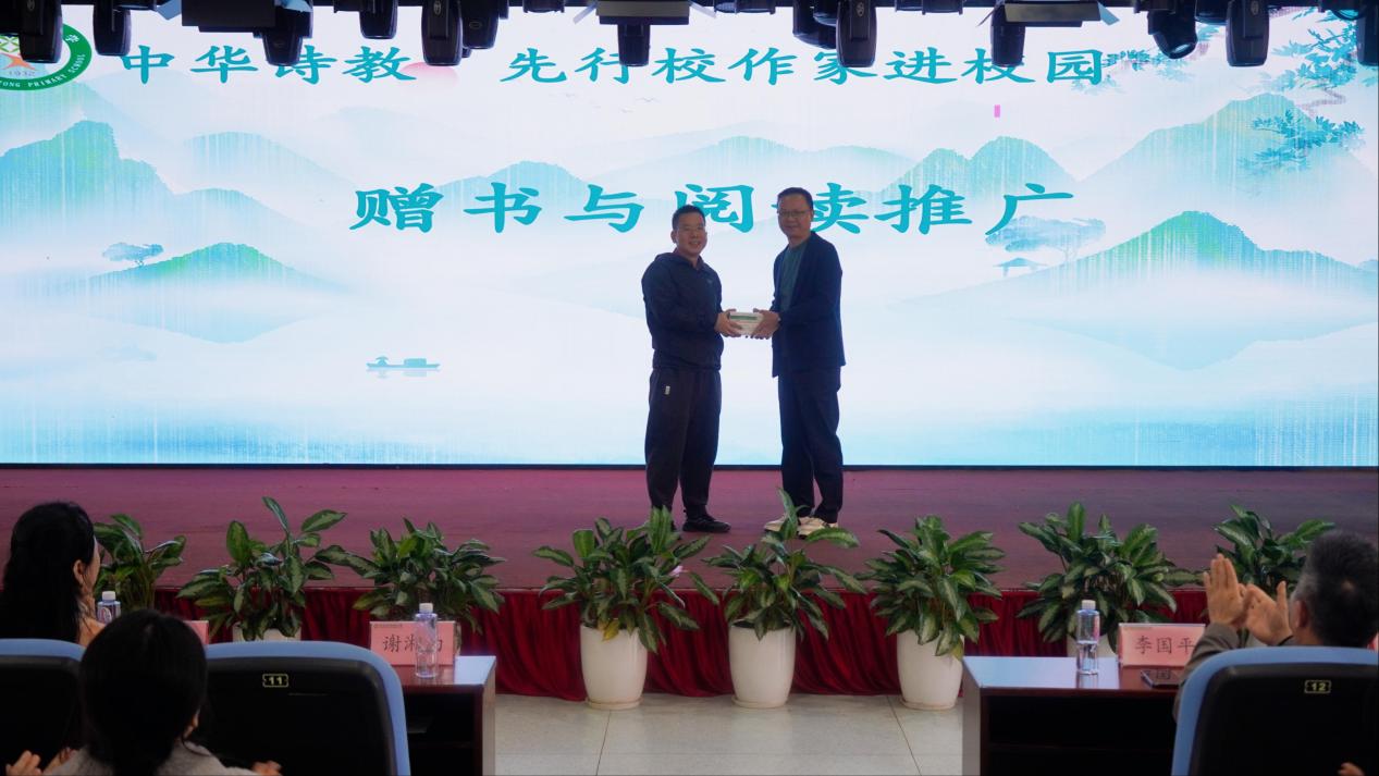 活动尾声,谢湘南老师代表罗湖区作家协会向学校深情赠送了《南方叙事丛书》及个人诗集《深圳诗章》《谢湘南诗选》等。这份沉甸甸的礼物,不仅承载着一位诗人对教育的关怀,更象征着文学星火在校园的传递。学校黄鑫焕副校长代表学校接受了赠书。学校书记张秀娟和副书记刘晓明为谢老师回赠鲜花,颁发荣誉证书,并对谢老师带来的诗意盛宴表示衷心感谢。