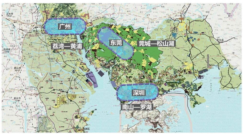 规划从东莞全域空间层面出发,提出松山湖新城、同沙生态区与莞城中心城区“三位一体”的空间结构,共同形成东莞中心城区的规模空间格局,以成为珠江东岸广州、深圳城市区域发展的大“三位一体”空间结构体系中特别的功能节点。