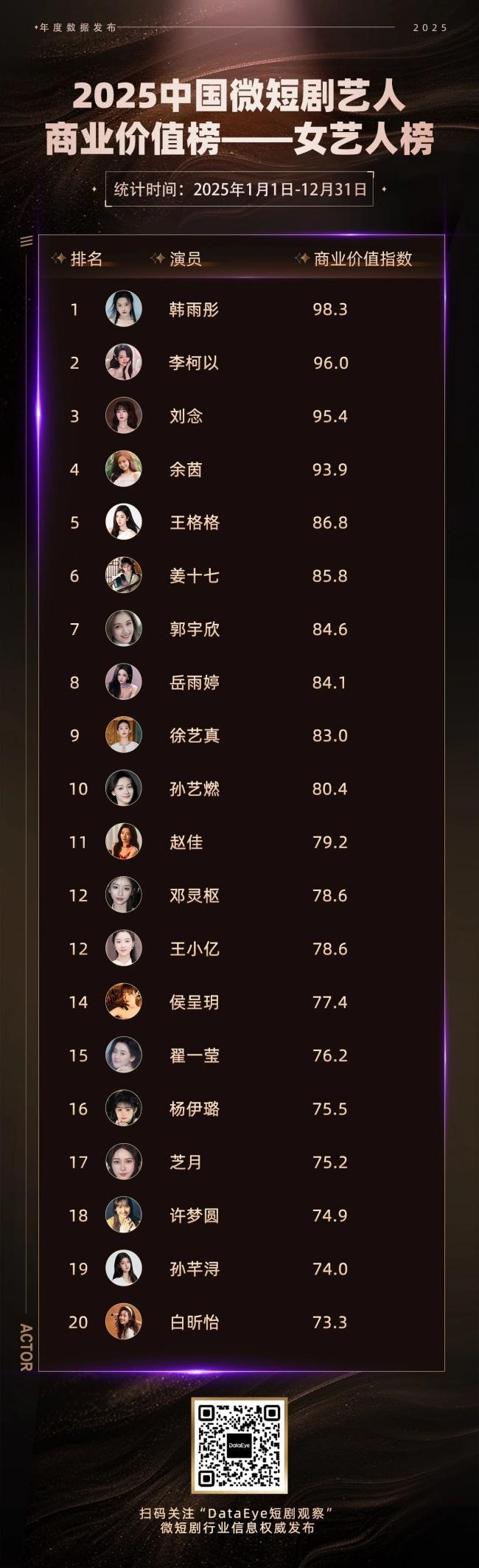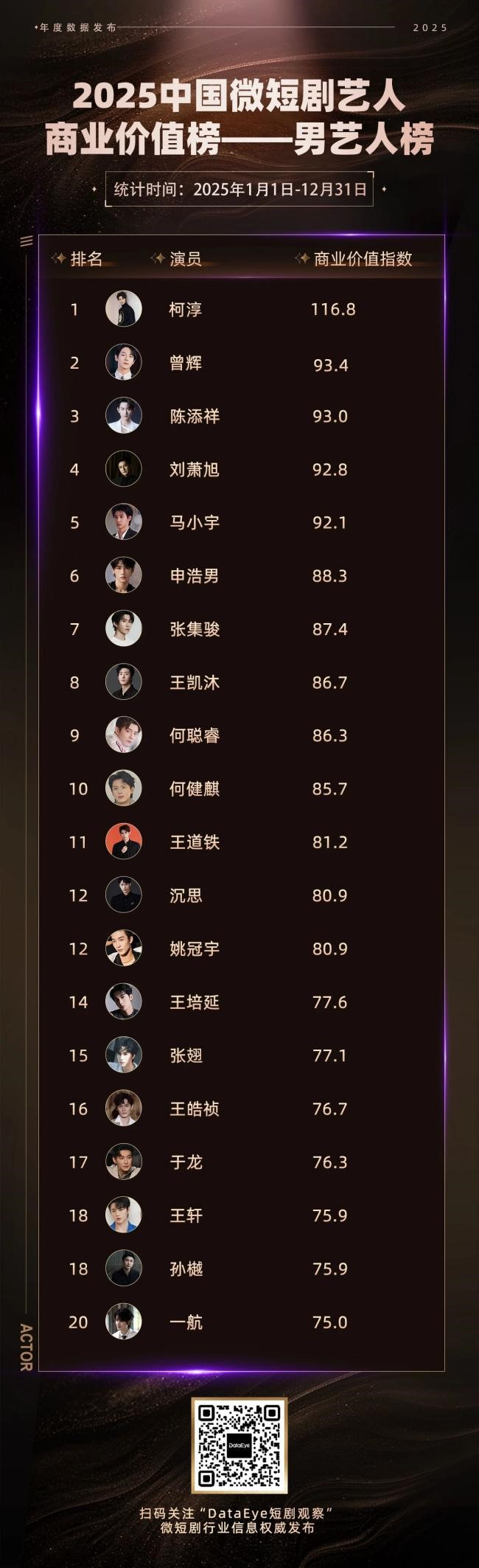 2025年度短剧艺人商业价值榜单发布 柯淳、曾辉、陈添祥、韩雨彤、李柯以、刘念等位居前列