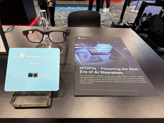 本届CES上,AI眼镜、运动智能眼镜等新形态穿戴设备密集亮相,推动了对高性能、小体积存储的迫切需求。在此趋势下,江波龙同步发布专为新一代AI穿戴设备设计的存储新品ePOP5x。该产品创新性地融合了LPDDR5x高速内存与新一代3D NAND闪存,搭载系统快速启动、低功耗技术、SoC调优等自研算法,以小尺寸、低功耗、高性能为核心优势,为穿戴设备提供高效的存力支持。