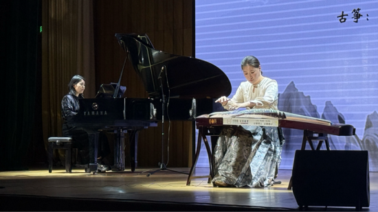 音乐会在经典筝重奏《渔舟唱晚》的悠扬旋律中拉开帷幕,婉转筝声勾勒出江南水乡的诗意画卷,将现场观众带入传统民乐的独特意境。随后,刘晓倩老师携手钢琴演奏者演绎《枫桥夜泊》,传统筝韵与现代钢琴技法巧妙融合,既展现出古筝艺术的深厚文化底蕴,也彰显了演奏者对民乐艺术的创新诠释,为音乐会奠定了典雅且富有层次的艺术基调。