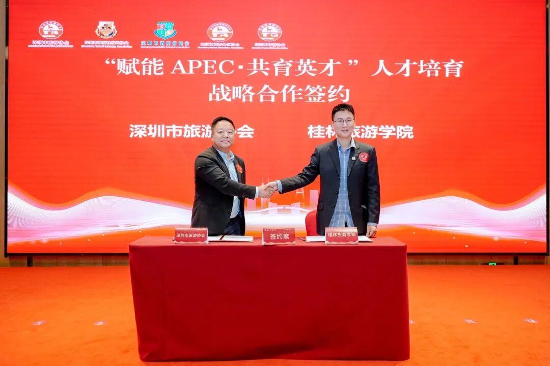 盛典现场还举行了两项重要签约仪式:深圳市旅游协会与桂林旅游学院共同签署“赋能APEC・共育英才”人才培育战略合作;深圳市旅游协会与暨南大学深圳旅游学院携手达成“文旅融合 产业创新”实践教学基地合作签约,标志着深圳在旅游人才培养与产学研融合方面迈出坚实步伐。