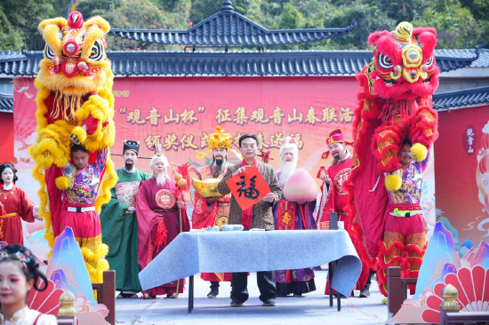 关注楹联迎春,翰墨送福。2月1日,东莞观音山举行了马年春联颁奖暨揭联仪式,两幅火红的春联,正式亮相观音山门楼与福缘门。锣鼓醒狮相伴,楹联名家们现场挥春送福,免费送春联,“福禄寿喜财”五福NPC天团现场助阵,吸引众多市民游客现场围观。观音山年味儿满满的新春活动,也就此拉开东莞丙午马年新春序幕。