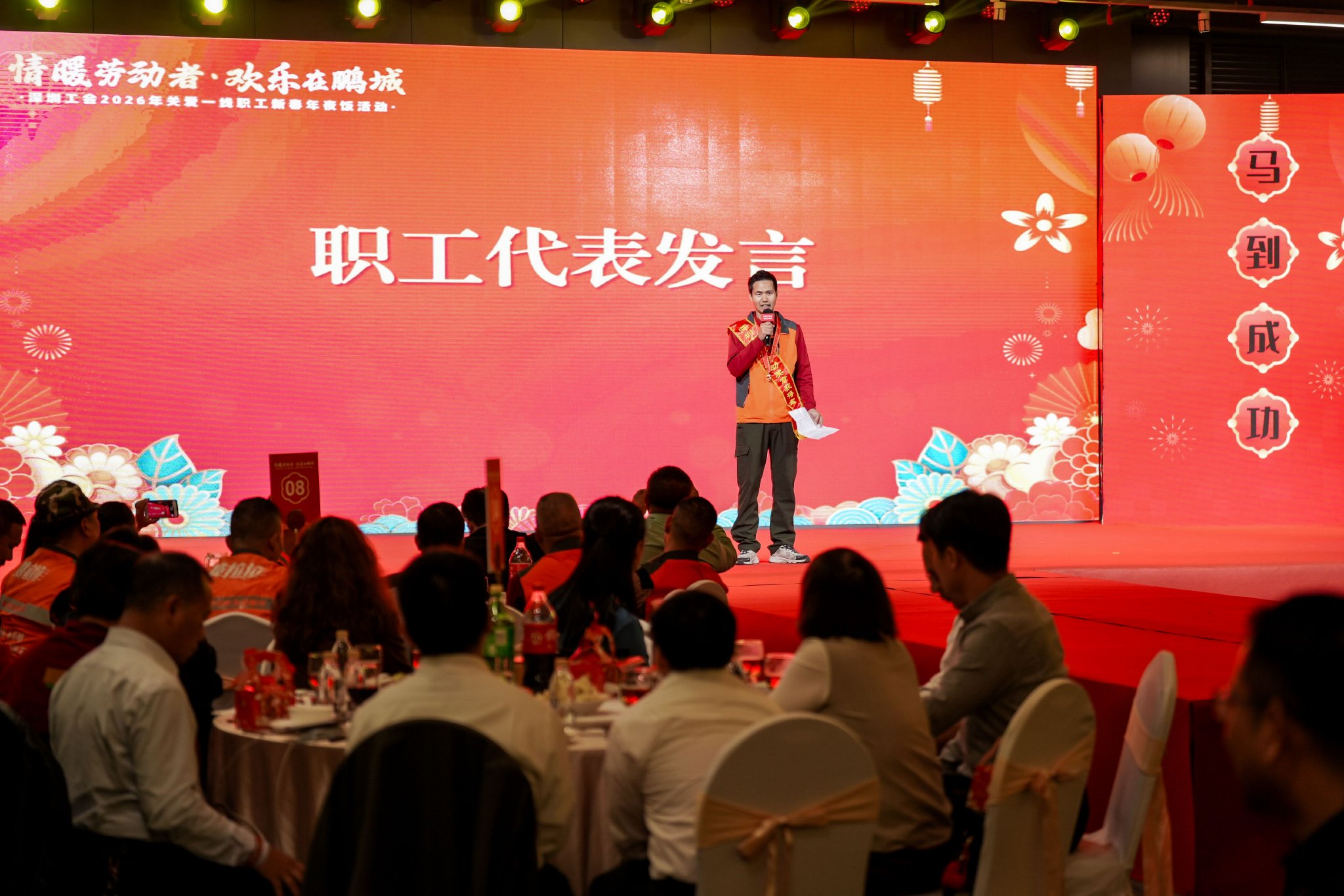 2月5日,2026年深圳工会“情暖劳动者 欢乐在鹏城”关爱一线职工新春年夜饭活动在罗湖区水贝壹号温暖开宴,来自深圳各行各业的300余名新业态劳动者、一线职工代表欢聚一堂,共品佳肴、共赏节目、共话家常,在浓浓的年味与暖意中喜迎农历马年新春。