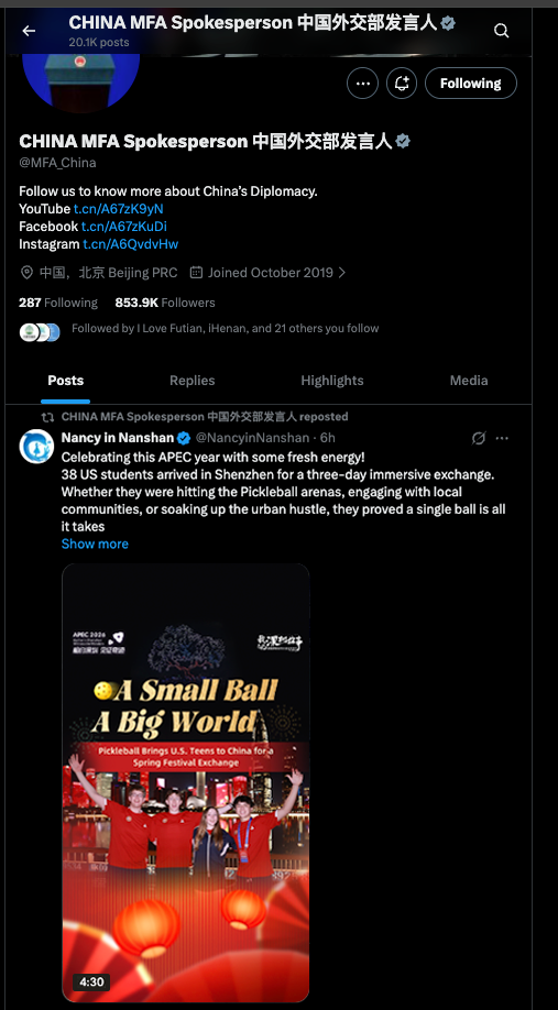 关注春节期间,一段跨越太平洋的友谊在网络上火了。2月24日,中国驻美国大使谢锋在海外社交平台X(原推特)发布了一段关于美国匹克球访华团在深圳的视频,这一视频由深圳市南山区融媒体中心策划并制作,讲述了45名美国师生以匹克球为契机,深入感知南山区的社区、校园和景区,沉浸式体验中国春节的浓郁氛围,书写了一段跨越万里的友谊篇章。
