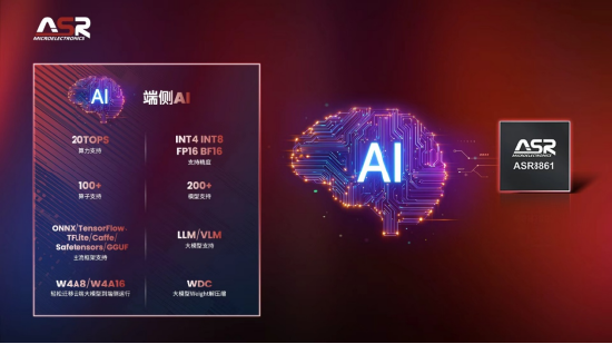 在AI从云端加速向设备侧迁移的趋势下,端侧AI正成为智能终端体验升级的关键驱动力。ASR8861集成自研NPU,提供高达20Tops的端侧算力,支持 INT4、INT8、FP16、BF16 等多精度计算,并兼容ONNX、TensorFlow、TFLite等主流AI框架,为客户构建起完整、开放且高效的端侧AI运行环境。
