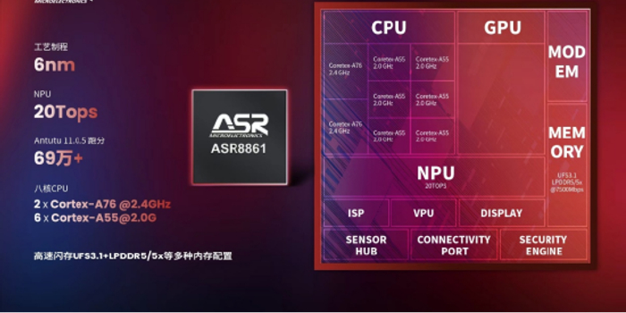 ASR8861平台采用八核架构,由2个主频为2.4 GHz的Cortex-A76与6个主频为2.0 GHz的Cortex-A55组成,并基于6 nm成熟制程工艺,在性能与能效之间实现优化平衡。在安兔兔11.0.5评测中,ASR8861综合跑分突破69万分,在4G平台中展现出领先的系统性能表现,为流畅应用、多任务处理及 AI 体验提供坚实算力基础。