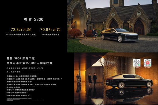 搭载新一代激光雷达的尊界S800,已于2026年3月4日开启预定,建议零售价72.8万元起,即刻下定,至高可享价值153000元购车权益,权益截止时间为2026年3月31日23:59:59。