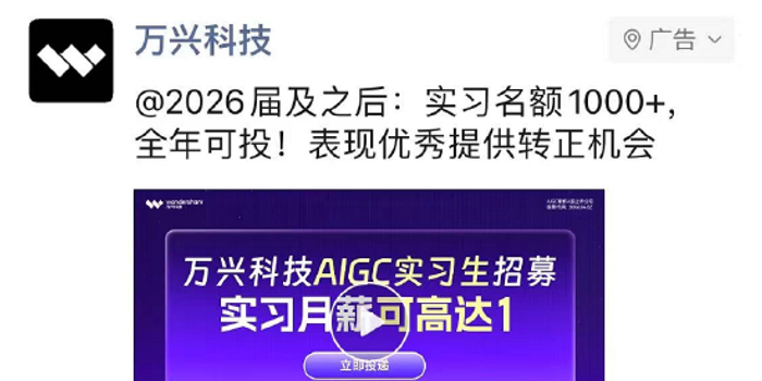 万兴科技“新星计划”刷屏长沙深圳社交圈 AI实习生实习月薪可高达万元