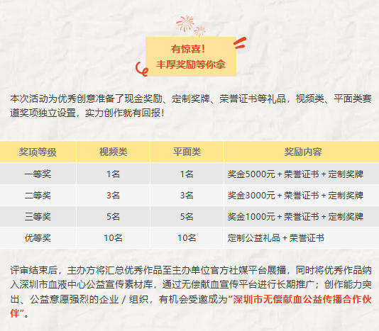 (2)投稿后,可在视频号、微博、小红书平台搜索话题#深圳无偿献血创意征集活动##无偿献血故事分享#发布作品片段、创作思路或献血相关感悟,主办方将择优转发,提升作品曝光度,随机掉落官方活动周边文创。
