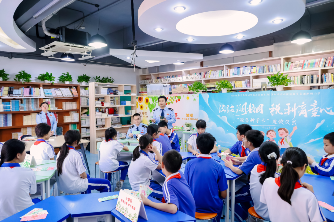 南山区税务局联合深圳市税务局第二稽查局、麒麟小学,共同举办第 21 届“少年税校”之“税苗向阳 童心守税”主题系列活动。活动组织百余名小学生,通过观看视频、趣味课堂、仪式体验、研学实践等沉浸式环节,让孩子们在看得见、摸得着、听得懂的体验中解锁税收知识,让依法诚信纳税护税的法治种子,在童心深处生根发芽。