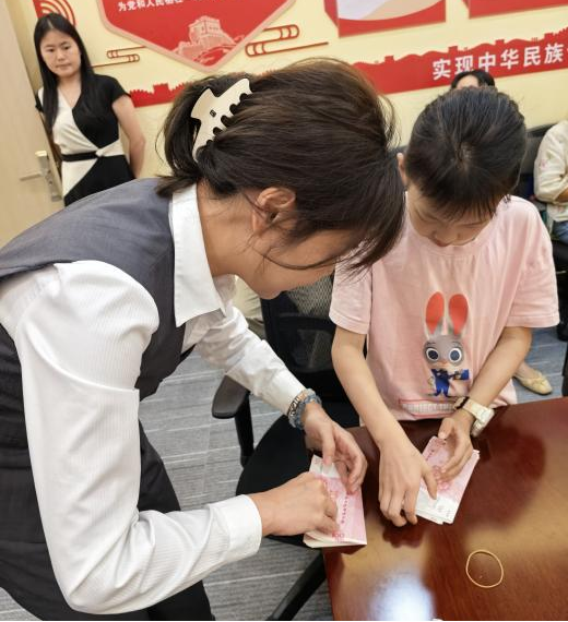 在银行职业体验环节,孩子们化身“小小银行职员”,学习标准服务礼仪和点钞技能,并实地参观营业厅智能设备,亲身体验银行日常运作。特别值得一提的是,部分小朋友在家长陪同下完成了人生第一次开户,拥有了自己的银行卡。