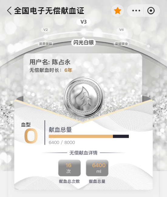 6400毫升是什么概念?一个成年人全身血量约4000-5000毫升,他的献血量已经超过了一个成人的全身血量,相当于为数十位急需用血的患者点亮了生命的希望。