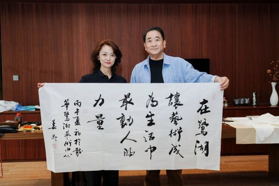 当天下午,姜昆首先来到鹭湖艺术中心,实地参观场馆设施、功能布局与运营规划,详细了解龙华公共文化服务体系建设成果。在座谈交流中,他围绕传统文化传承、艺术普及、文化惠民、品牌打造等方面深入交流,为艺术中心运营与文化活动开展提出指导性意见。座谈最后,姜昆现场为鹭湖专访栏目挥毫题字,寄语龙华文化事业高质量发展,助力打造特色鲜明的城区文化品牌。