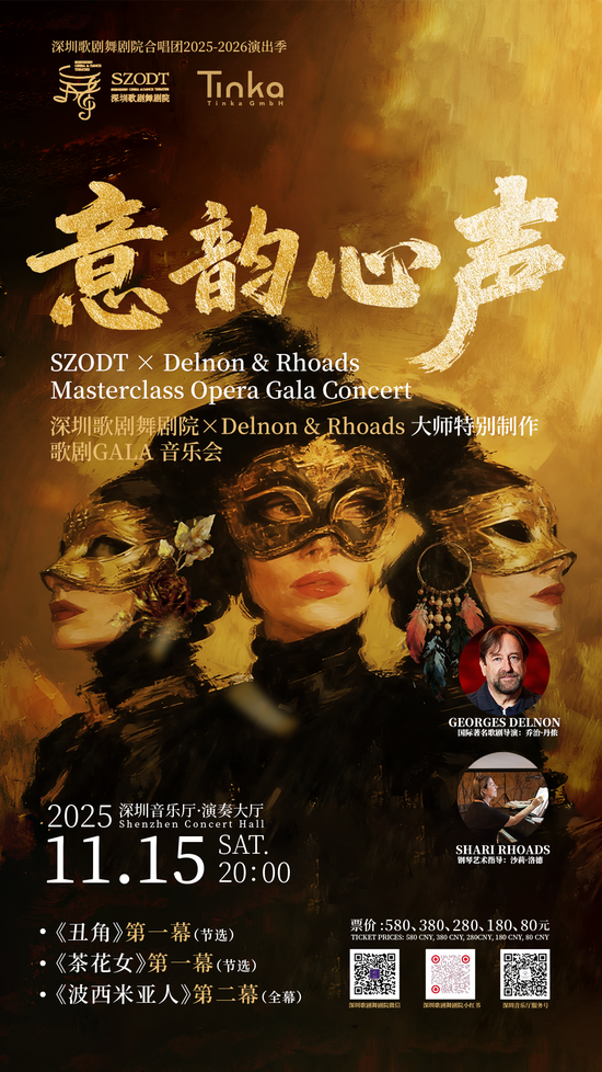 关注2025年11月15日,深圳歌剧舞剧院 X Delnon & Rhoads 大师特别制作: 歌剧GALA 音乐会将于深圳音乐厅举行。本场音乐会是大师班歌剧青年演员在接受国际顶尖导师密集指导后的成果呈现,聚焦于歌剧表演中“戏剧”与“音乐”两大核心素养的深度锻造。