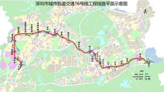 地铁16号线由大运站引出,沿龙岗大道、黄阁路、龙平路敷设,经龙岗老中心后沿深汕公路往南至坪山站,经坪山中心区后沿东纵路、金田路等路敷设至终点田心站。线路全长约29.2公里,设站24座。