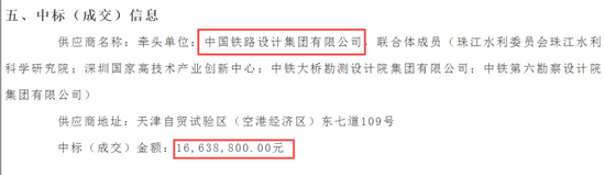 据公告显示,中标供应商牵头单位为中国铁路设计集团有限公司,联合体成员(珠江水利委员会珠江水利科学研究院,深圳国家高技术产业创新中心,中铁大桥勘测设计院集团有限公司,中铁第六勘察设计院集团有限公司)中标,中标(成交)金额1663.88万元。