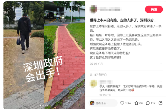 “世上本没有路,走的人多了,深圳政府会出手!”一位深圳市民发帖分享道:“这里起初是一片绿茵草地,因周边上班族抄小路去单位,日复一日硬是踏出了一条泥巴路。”他提到这条路后来铺上黑色石头,没多久开始正式修建,现在就算遇上雨天行走也舒适。