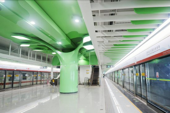 同步建设的溪涌站围绕“阳光+”设计理念,在山海资源丰富的自然环境基础上引入“生态绿谷”概念,将古树意象融入车站建筑结构与灯光设计,两侧墙面以远山轮廓为灵感延展空间视觉,使站体与周边生态环境自然衔接。整体空间明亮通透、富有生命力,为市民带来更加舒适、友好的乘车体验。